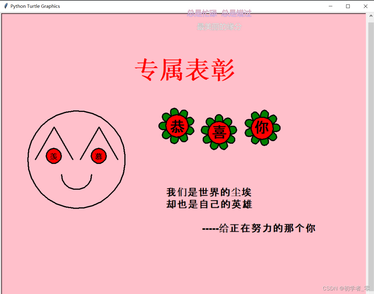 xx = '我们是世界的尘埃\n却也是自己的英雄\n\n -----给正在努力的那个你'