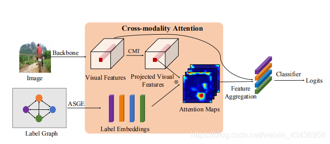 图1:MLIC任务模型的总体框架,标签嵌入由ASGE(基于邻接的相似图嵌入)模块获得。首先利用骨干网络提取视觉特征,然后通过CMT模块将其投影到语义空间中,得到投影的视觉特征,将学习到的标签嵌入和投影的视觉特征一起输入到CMA模块中,以生成按类别分类的关注图,其中每一个都用于对视觉特征进行加权平均并生成按类别聚合的特征。 最后,将分类器应用于最终预测