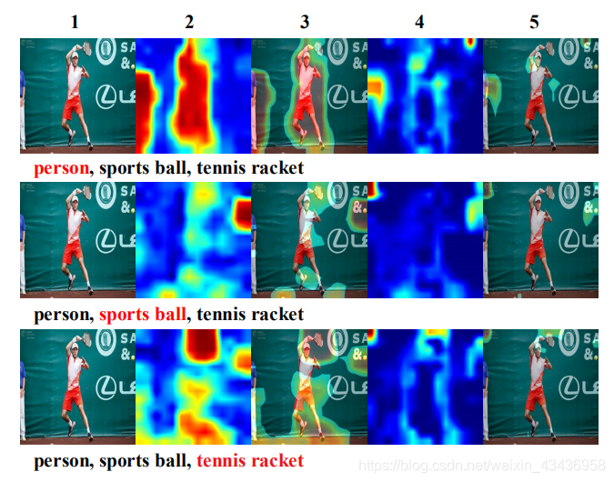我们在图4中显示注意力可视化示例。 三行分别显示了由CMA模型生成的类别注意图和一般自我注意。可以看出,CMA模型比一般的自我注意更集中在语义区域上,并且具有更强的响应能力,因此它能够利用更多的区别性和有意义的信息。此外,我们的CMA机制能够捕获空间语义依赖,特别是对于图像中出现的不可识别或较小的物体,例如运动球的注意力也会因为语义相似而关注网球拍。这是非常有用的,因为这些物体需要更丰富的上下文线索来帮助识别