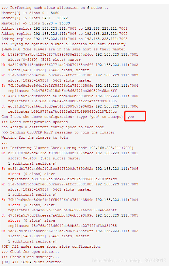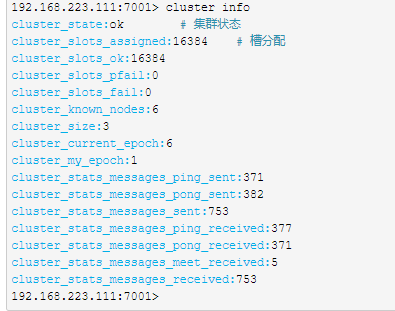 ./redis-cli --cluster create 192.168.223.111:7001 192.168.223.111:7002 192.168.223.111:7003 192.168.223.111:7004 192.168.223.111:7005 192.168.223.111:7006 --cluster-replicas 1