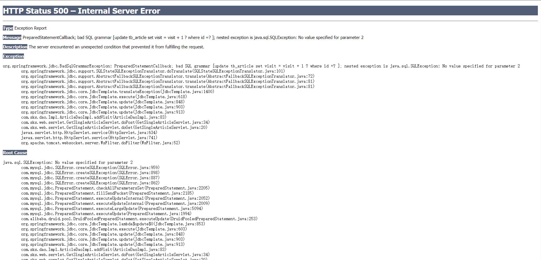 nested exception is java.sql.SQLException: No value specified for parameter 2
