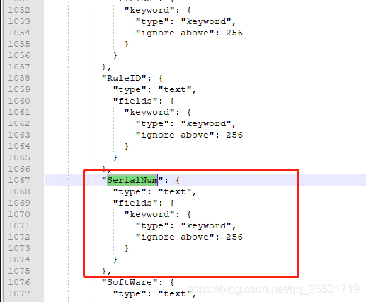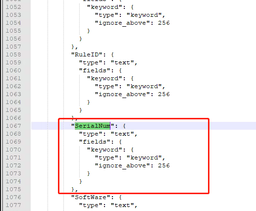 2.由于其区别如上,所以去查看索引的mapping文件,发现我们要找的字段设置如下:默认为text,fields表示对一个字段设置多种索引模式,同一个字段的值,一个分词,一个不分词。