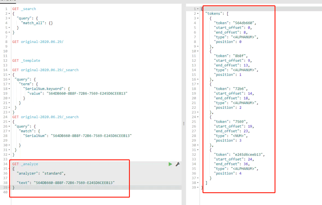 3.去查看该索引设置的分析器,发现未设置,即为elasticsearch默认的standard 分词器,使用分词器对查询的字段内容分词,结果如下: