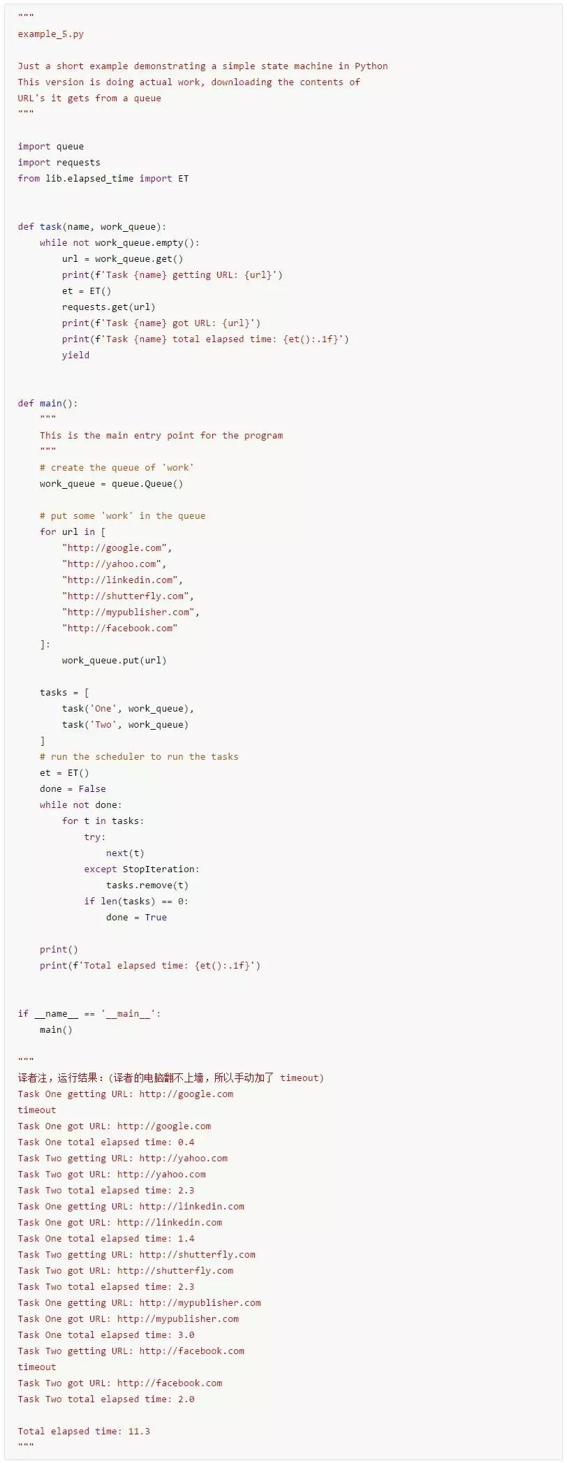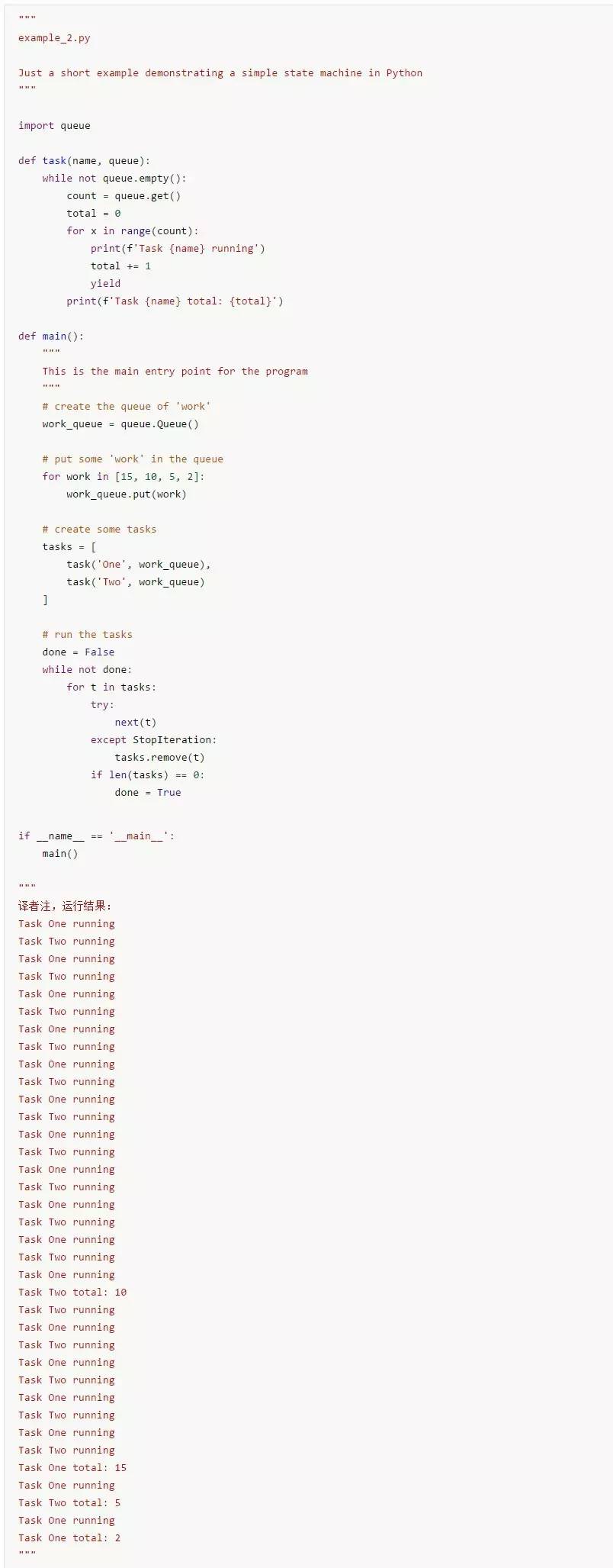 这个例子实现的技巧是使用了 yield 语句将任务函数转换为生成器,以便切换的时候保存上下文。也正是利用这一点才实现了两个不同的任务实例之间的切换。