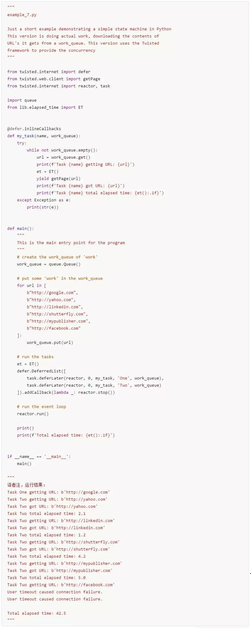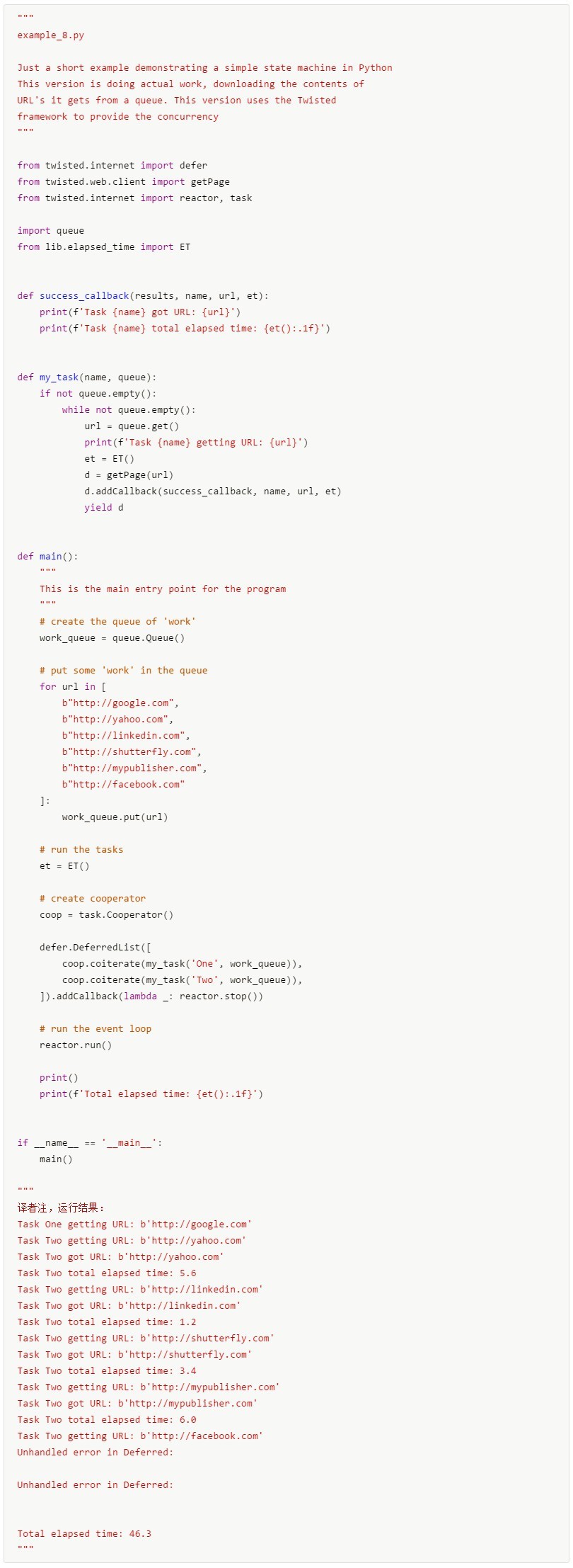例6 中是用修补 requests.get(url) 的方式获取页面,现在我们改用 Twisted 提供的 getPage(url) 方法。