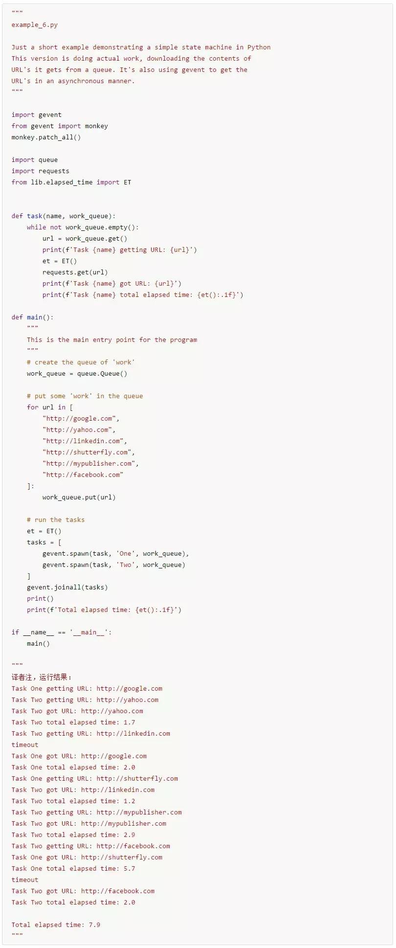 现在 requests.get(url) 函数可以通过协程的事件循环来切换上下文,转换成非阻塞模式了,也就不用写 yield 了。在任务执行部分,我们使用协程来启动两个任务,最后用 joinall 方法等待它们执行完毕。