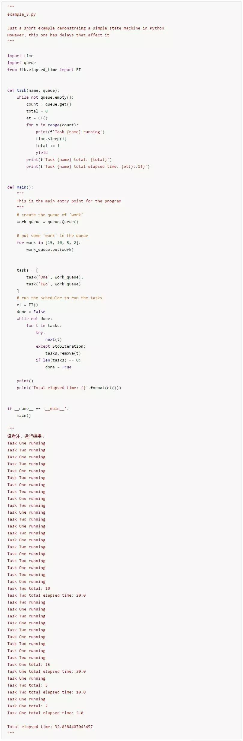 这个例子是上例的升级版,加入了 Python 的生成器,这样就可以让两个任务进行。在任务函数执行部分加入了 yield 关键字,这意味着循环执行到这一句就会退出,同时保存上下文环境,等到需要的时候再继续运行。下面代码中 # run the tasks 的地方就利用了这个特性,使用 t.next 方法来唤醒之前的任务,让它在刚才 yield 的地方继续。