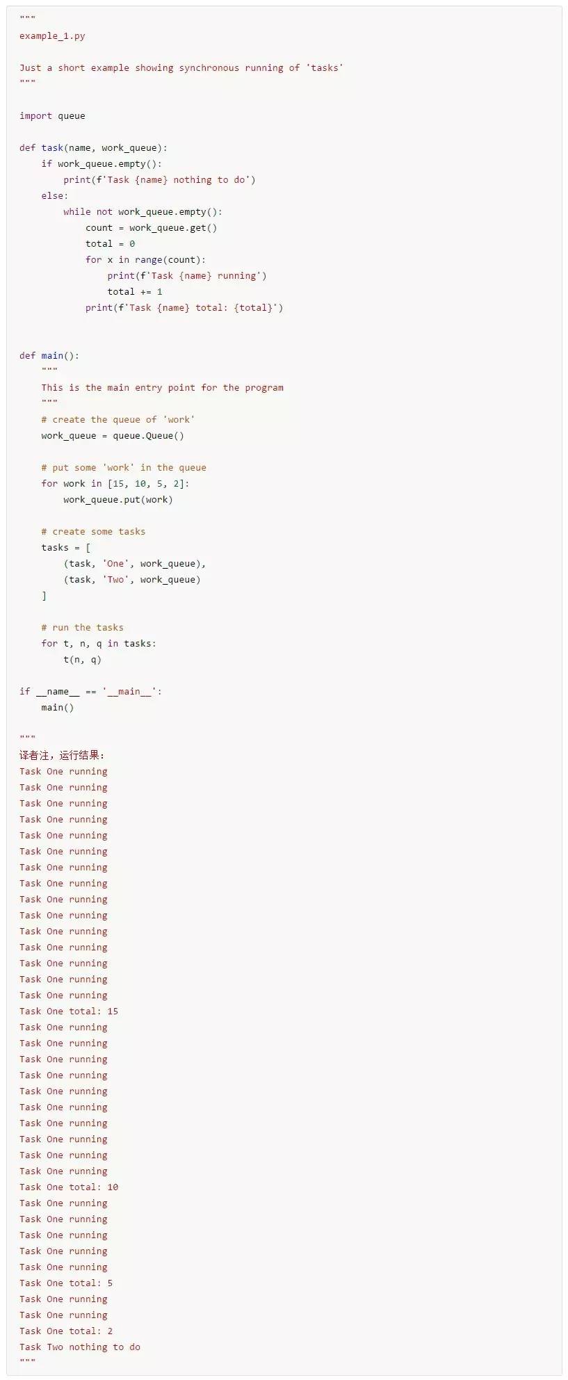 程序里的任务其实就是一个函数,它接收两个参数,一个字符串,一个队列。执行的时候先检查队列里有没有要处理的工作(一个数字),如果有,就把它从队列里取出来,然后开始数数,数到头了就显示出来。不断重复这个过程,一直到把列表里的工作全部做完,然后退出程序。