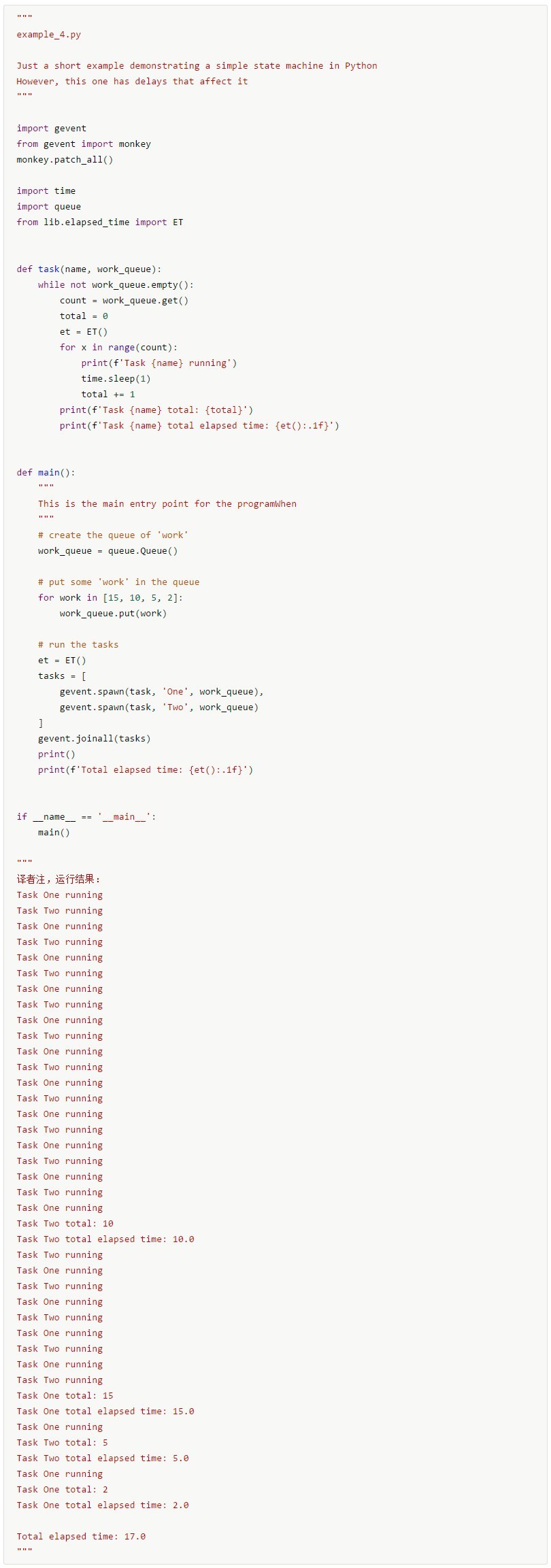 我们之前写的多任务循环也可以删掉了,任务列表加入两个 gevent.spawn 函数。它们负责启动两个协程线程(我们称为 greenlets),这是一种轻量级的微线程,可以用协程的方式来切换上下文,不需要像普通线程那样由系统来切换。