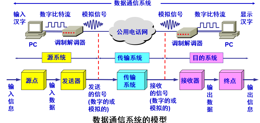 (4)基带信号:来自信源(如计算机)的信号称为基带信号。如计算机输出的图片和文字。