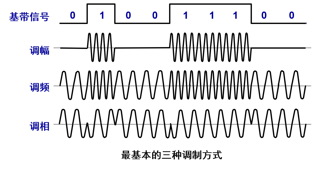 ②带同调制:使用载波进行调制,把基带信号的频率搬移到较高的频段,并转换为模