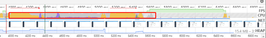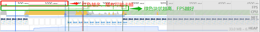区域2:overview【网页性能总览图】: FPS(每秒帧数情况)、CPU(CPU占用情况)、NET(网络资源情况)、HEAP(JS占用情况)一共四项指标。