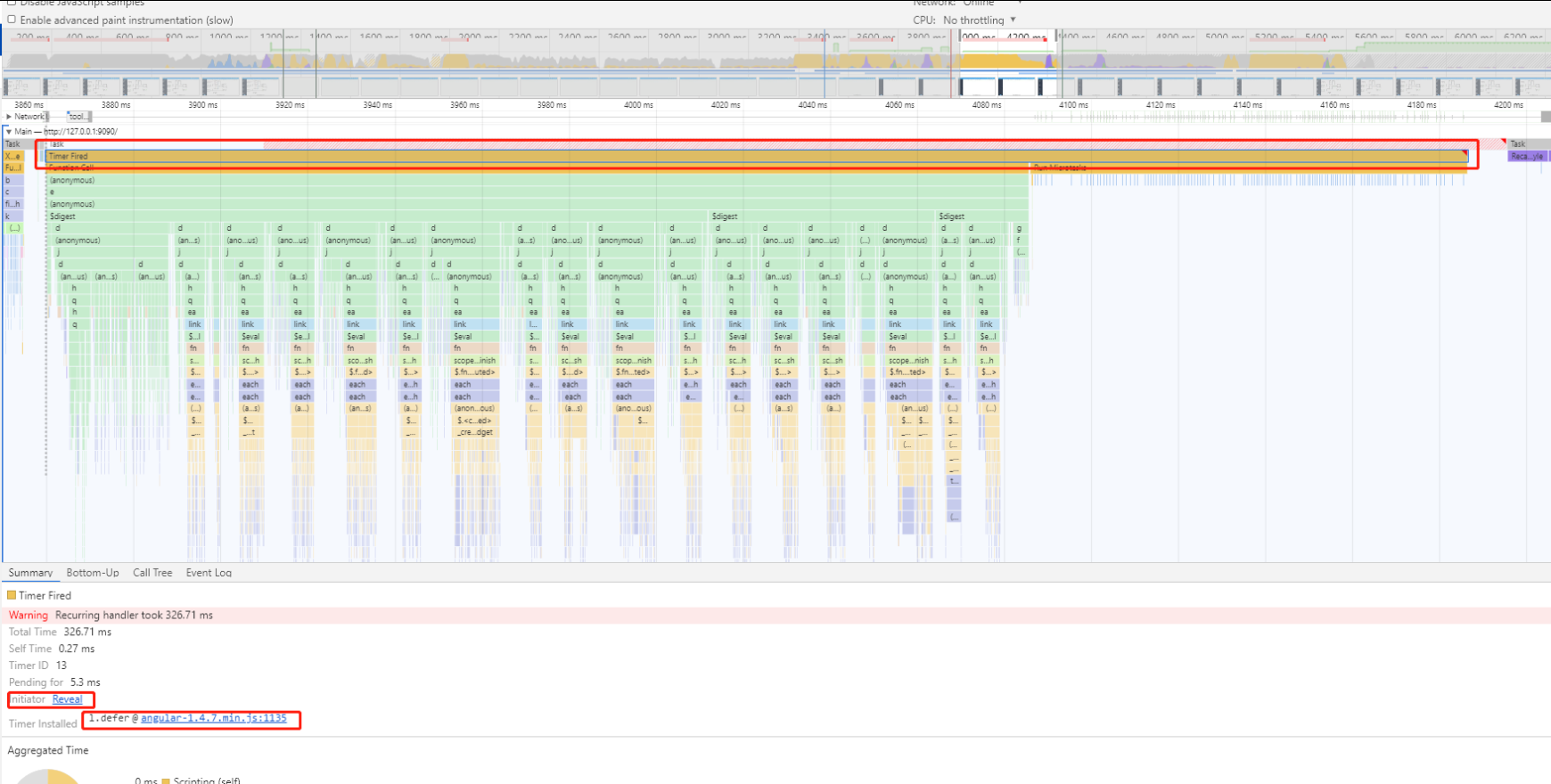 如果在性能长条中的右上角出现了红色的三角形,说明这个事件存在问题,需要特别留意。双击这个带有红色小三角的的事件。在Summary面板会看到详细信息。注意reveal这个链接,双击它会让高亮触发这个事件的event。如果点击了angular-1.4.7.min.js:1135这个链接,就会跳转到对应的代码处。