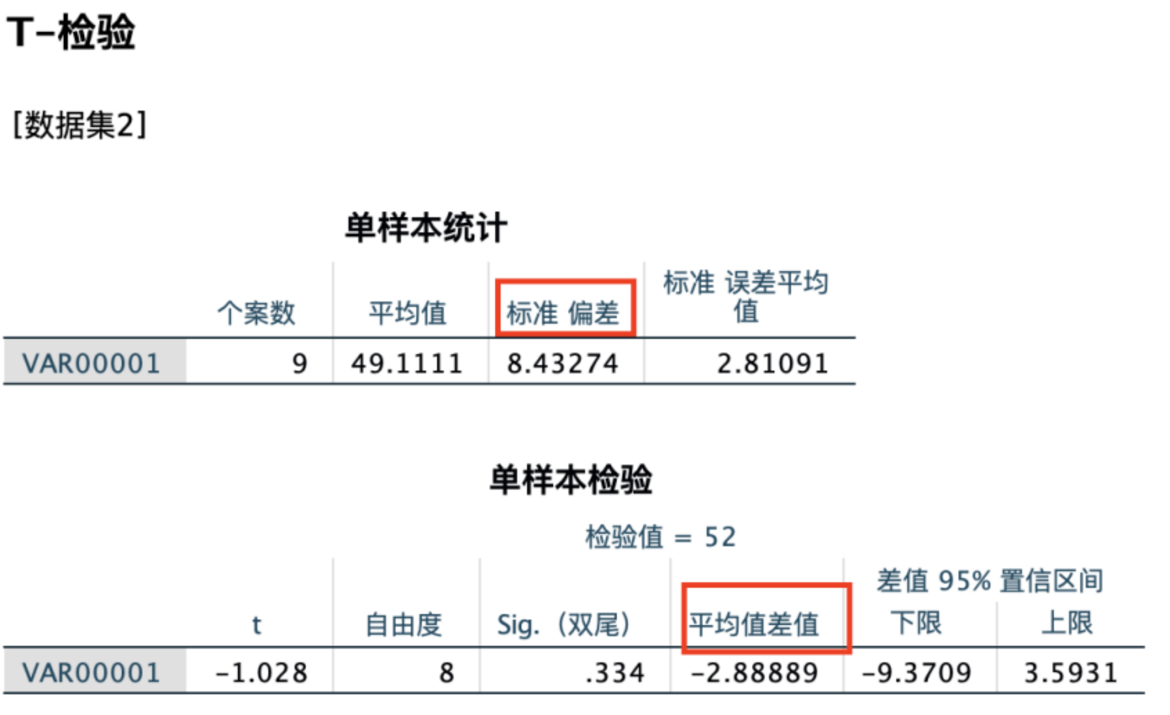 主要看.sig(双尾),如果>0.05接受原假设,如果<=0.05接受原假设。接着看平均值差值,根据其并结合平均值看是否高出原有总体样本均值。最后计算d(效应量),d=平均值差值/标准偏差,分别由小(d=0.2)、中(d=0.5)、大(d=0.8)的效应量。