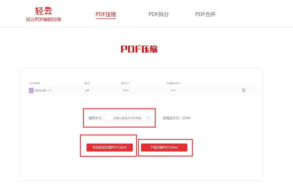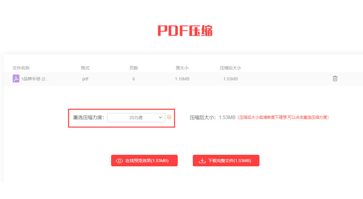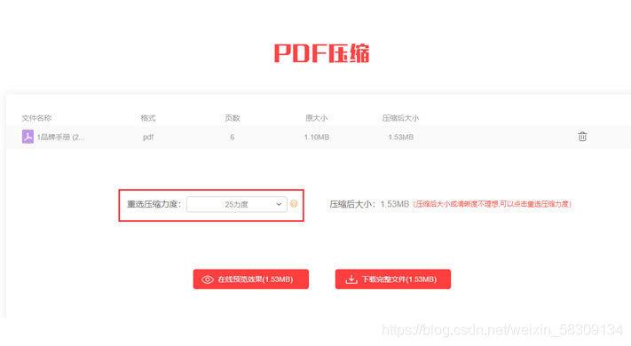 pdf上传完成后网站会自动开始压缩,如果压缩出来大小不理想,可以重新选择压缩力度。
