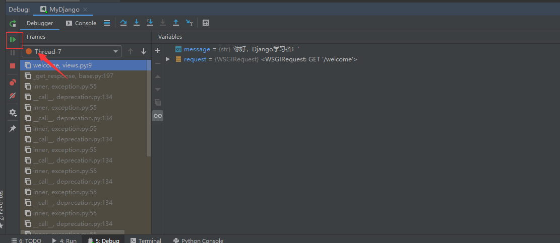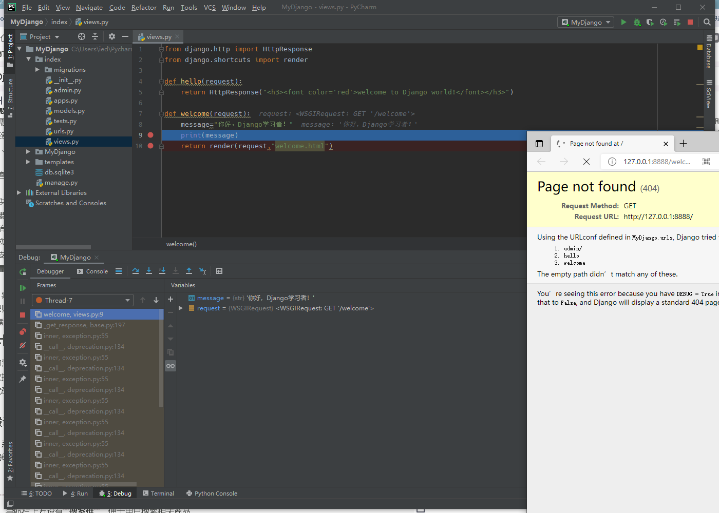 3. 浏览器访问http://127.0.0.1:8888/welcome,此时在9行设置了断点,没有执行到return语句,因此welcome.html页面暂时是访问不了的