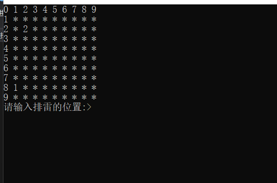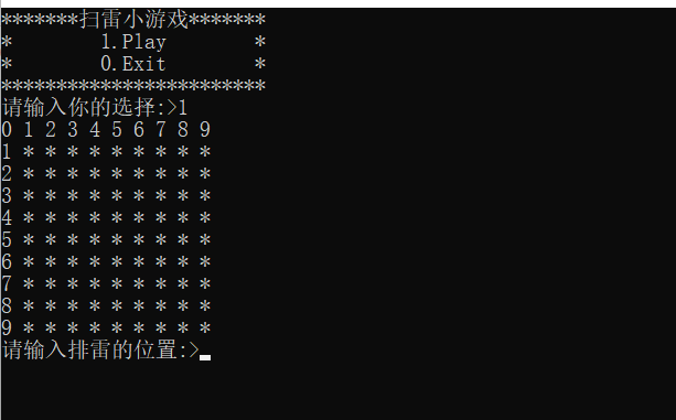 2.布雷时,‘0’代表该位置没有雷,‘1’代表该位置有雷(以‘1’代表有雷是为了方便后面对于所选位置周围雷数的计算);