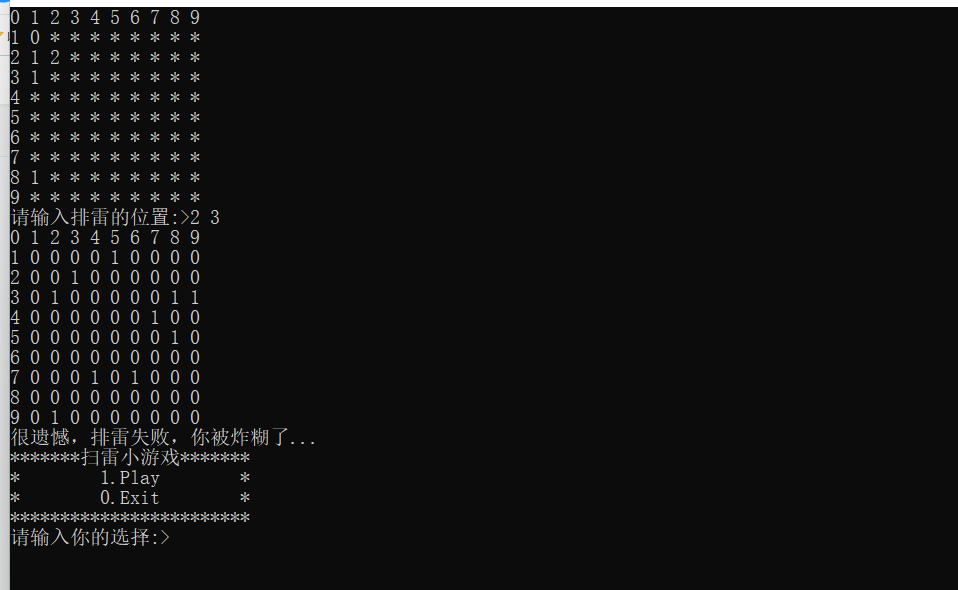 printf("很遗憾,排雷失败,你被炸糊了...\n");