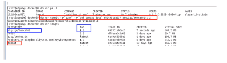 3. docker commit -a="作者" -m="描述" 容器id 上传镜像的名称