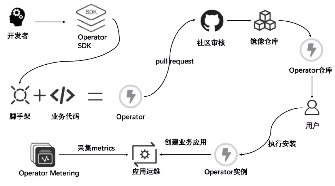 下图为一个 Operator 项目从开发到开源到被使用的全生命周期流程: