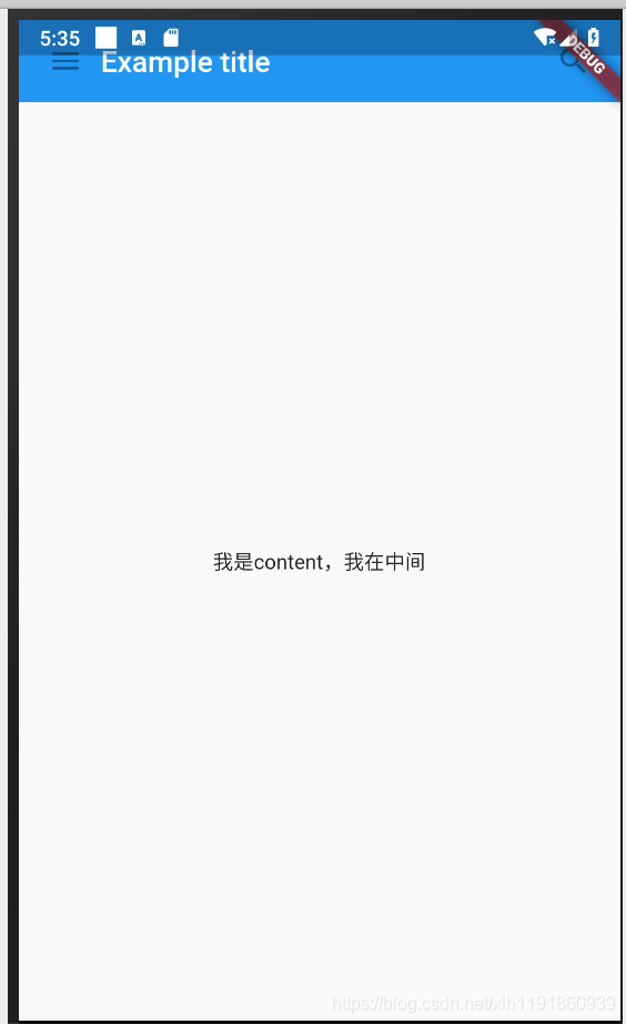 class MyScaffold extends StatelessWidget { @override Widget build(BuildContext context) { return Material( child: Column( children: <Widget>[ MyAppBar( title: Text( 'Example title', style: Theme.of(context).primaryTextTheme.title, ), ), Expanded( child: Center( child: Text('我是content,我在中间'), ), ), ], ), ); } } class MyAppBar extends StatelessWidget { final Widget title; MyAppBar({this.title}); @override Widget build(BuildContext context) { return Container( height: 56.0, padding: const EdgeInsets.symmetric(horizontal: 8.0), decoration: BoxDecoration(color: Colors.blue[500]), child: Row( children: <Widget>[ IconButton( icon: Icon(Icons.menu), onPressed: null, ), Expanded( child: title, ), IconButton(icon: Icon(Icons.search), onPressed: null) ], ), ); } }从MyScaffold中看起: