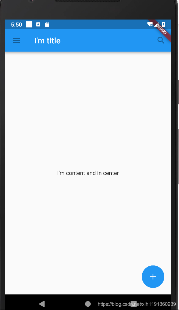void main() { runApp(MaterialApp( home: MaterialHome(), )); } class MaterialHome extends StatelessWidget { @override Widget build(BuildContext context) { return Scaffold( appBar: AppBar( leading: IconButton(icon: Icon(Icons.menu), onPressed: null), title: Text("I'm title"), actions: <Widget>[ IconButton( icon: Icon(Icons.search), onPressed: null, ) ], ), body: Center( child: Text("I'm content and in center"), ), floatingActionButton: FloatingActionButton( onPressed: null, child: Icon(Icons.add), ), ); } }- Scaffold:脚手架,它实现了基本Material布局