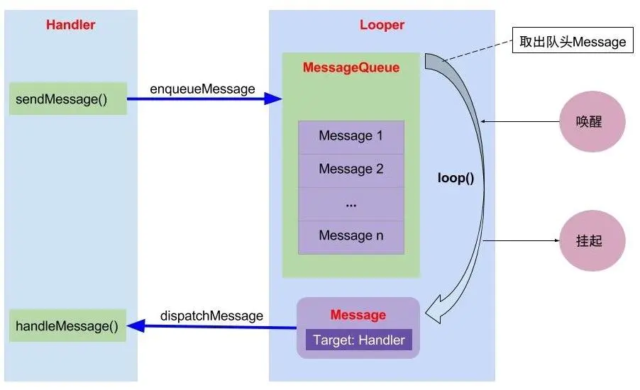 Looper的作用就是,当Java层的消息队列中没有消息时,就使Android应用程序主线程进入等待状态,而当Java层的消息队列中来了新的消息后,就唤醒Android应用程序的主线程来处理这个消息