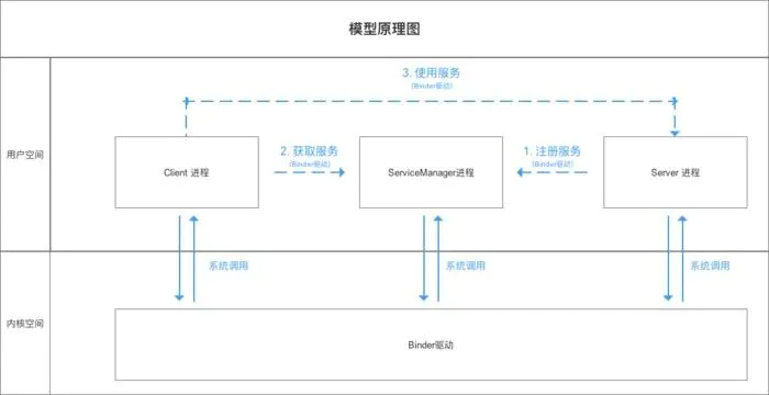 Client进程、Server进程 & Service Manager进程属于进程空间的用户空间,不可进行进程间交互