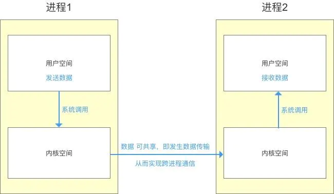 再通过进程内的用户空间&内核空间进行数据交互,从而实现进程间的用户空间的数据交互
