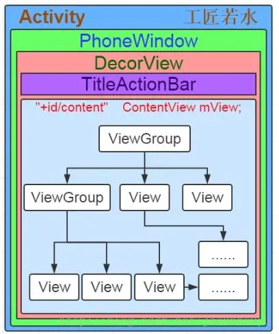 Activity的window组成,Activity内部有个Window成员,它的实例为PhoneWindow,PhoneWindow有个内部类是DecorView,这个DecorView就是存放布局文件的,里面有TitleActionBar和我们setContentView传入进去的layout布局文件