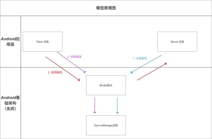 Binder驱动 & Service Manager进程 属于 Android基础架构(即系统已经实现好了);而Client 进程 和 Server 进程 属于Android应用层(需要开发者自己实现)