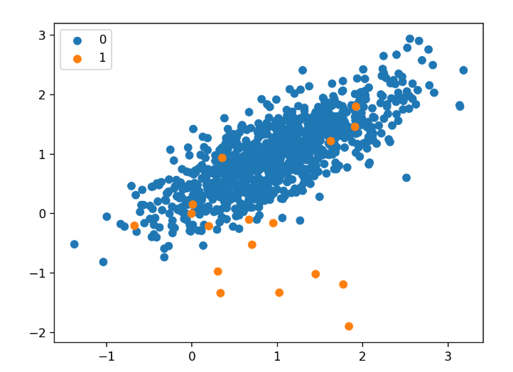 我们可以看到一个主类,属于类别0,一些零散的则属于类别1。可以看到,具有不平衡类标签属性的数据集在建模方面更具挑战性。