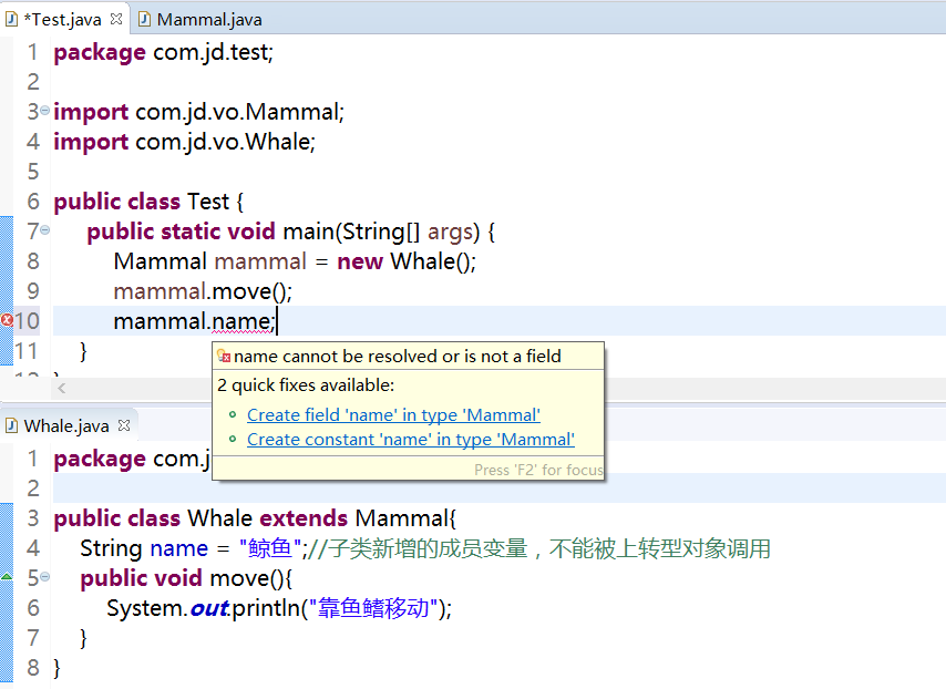 Mammal mammal = new Whale();//上转型对象,父类类型的变量指向子类声明的对象