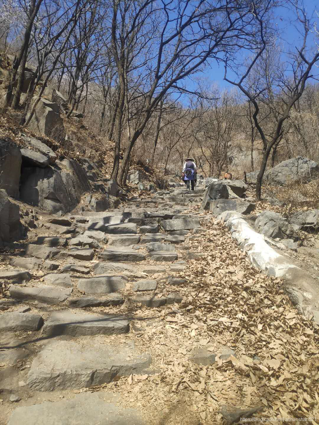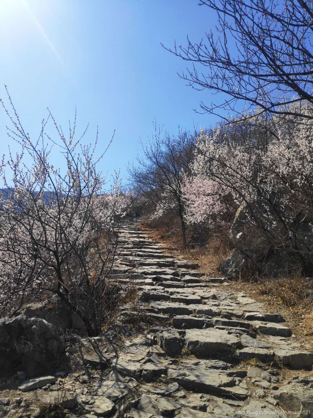 6、一路前行,全是石头的野路,走起来还挺有趣味,一定不要忘了抬头看看风景,非常美。尤其是桃花装点的山脉,美不胜收,是相片拍不出的震撼。