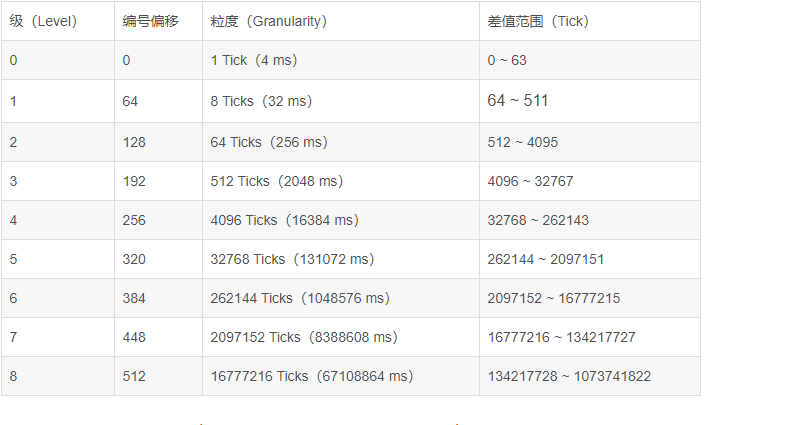 也就是第0级内64个桶中存放的所有定时器每个Tick都会检查,第1级内64个桶中存放的所有定时器每8个Tick才会检查,第2级内64个桶中存放的所有定时器每64个Tick才会检查,以此类推。