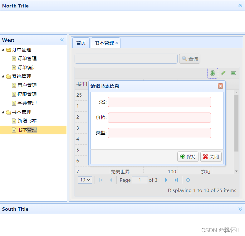<%@ page language="java" contentType="text/html; charset=UTF-8" pageEncoding="UTF-8"%> <!DOCTYPE html PUBLIC "-//W3C//DTD HTML 4.01 Transitional//EN" "http://www.w3.org/TR/html4/loose.dtd"> <html> <head> <meta http-equiv="Content-Type" content="text/html; charset=UTF-8"> <%@ include file="../../common/head.jsp" %> <title>Insert title here</title> <script> $(function(){ $('#bookTable').datagrid({ url: ctx+'/bookServlet', pagination:true, singleSelect:true, queryParams: { "bookName": $("#bookName").val() }, columns:[[ {field:'id',title:'书本ID',width:100}, {field:'bookname',title:'名称',width:100}, {field:'price',title:'价格',width:100,align:'right'}, {field:'booktype',title:'类型',width:100,align:'right'} ]], toolbar: '#bookTableToolbar' }); $("#bookQry").click(function() { qryBook(); }); qryBook(); function qryBook() { $('#bookTable').datagrid("load", { "bookName": $("#bookName").val() }) }; $("#addBookBtn").click(function(){ $("#editDialog").dialog({ title: '编辑书本信息', width: 400, height: 250, closed: false, cache: false, href: 'editBook.jsp', modal: true, buttons:[{ text:'保持', iconCls:'icon-add', handler:function(){ $.ajax({ url: ctx + "/bookAddServlet", type: 'post', data: $("#bookForm").serialize(), dataType: 'json', success: function(resp) { if(resp.success) { $.messager.alert('提示', '操作成功'); $('#editDialog').dialog('close'); qryBook(); } else { alert("not ok"); } } }); } },{ text:'关闭', iconCls:'icon-cancel', handler:function(){ } }] }); }); }); </script> </head> <body> <!-- 查询条件 --> <div style="margin-top: 15px; margin-left:10px;"> <input class="easyui-textbox" id="bookName" style="width:300px"> <a id="bookQry" class="easyui-linkbutton" data-options="iconCls:'icon-search'">查询</a> </div> <div id="p" class="easyui-panel" style="padding:10px" data-options="fit:true, border:false"> <table id="bookTable" class="easyui-datagrid" style="width:100%;height:90%;"> </table> </div> <!-- 列表上方的工具条 --> <div id="bookTableToolbar" style="text-align: right;"> <a href="#" id="addBookBtn" class="easyui-linkbutton" data-options="iconCls:'icon-add',plain:true"/a> <a href="#" id="editBootBtn" class="easyui-linkbutton" data-options="iconCls:'icon-edit',plain:true"/a> <a href="#" id="delBootBtn" class="easyui-linkbutton" data-options="iconCls:'icon-remove',plain:true"/a> </div> <div id="editDialog">Dialog Content.</div> </body> </html><%@ page language="java" contentType="text/html; charset=UTF-8" pageEncoding="UTF-8"%> <div> <form id="bookForm"> <input type="hidden" name="id" id="id"/> <div style="margin: 15px;"> <label for="name">书名:</label> <input class="easyui-textbox" name="bookname" style="width:300px" data-options="required:true"> </div> <div style="margin: 15px;"> <label for="price">价格:</label> <input class="easyui-textbox" name="price" style="width:300px" data-options="required:true"> </div> <div style="margin: 15px;"> <label for="booktype">类型:</label> <input class="easyui-textbox" name="booktype" style="width:300px" data-options="required:true"> </div> </form> </div>2.4servlet层代码开发
