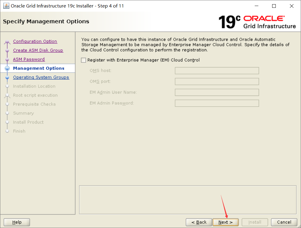 4)指定管理选项,若安装EMCC,可进行接入,这里忽略
