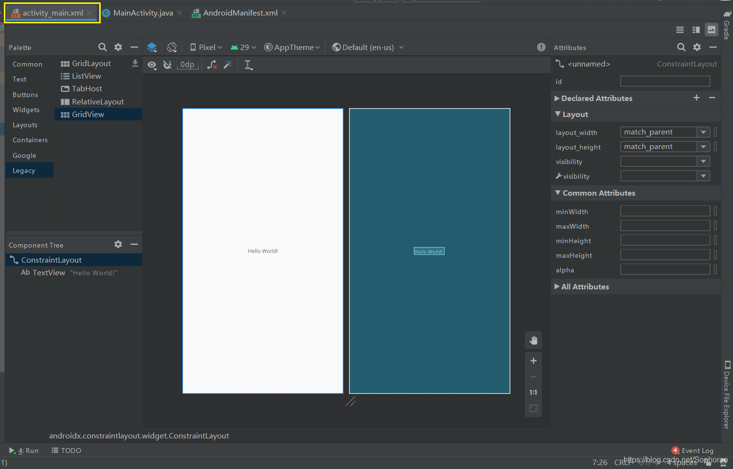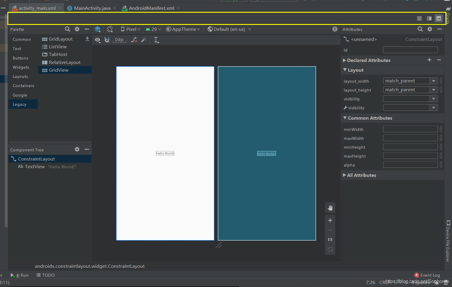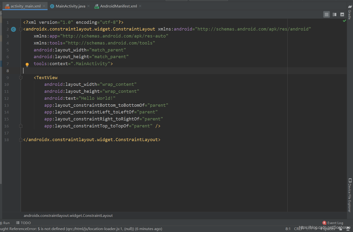 刚开始学Android,学《第一行代码》让打开布局文件并将其切换为“Text视图”,到这儿就没跟上,于是百度怎么转换,可能是版本原因吧,总和找到的帖子上说的不一样,但好在是有共通之处的,最终我找到了转换的图标。