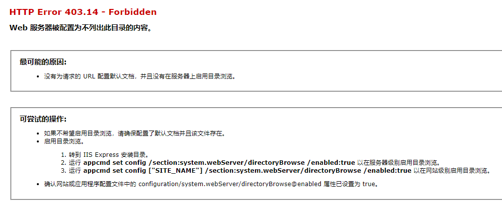 HTTP错误 403.14 - Forbidden 错误的解决方法今天工作中遇到这样的一个问题,如下图所示:折腾一下,发现,只要这样设置一下特定页就行了。 版权声明:本文为qq_41617901原创文章,遵循CC 4.0 BY-SA版权协议,转载请附上原文出处链接和本声明。原文链接:https://blog.csdn.net/qq_41617901/article/details/116151137