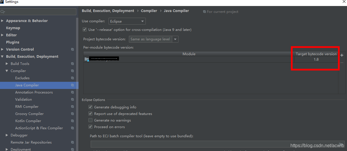 2、打开File-->Settings-->Build,Execution,Deployment-->Compiler-->Java Compiler-->Per-module bytecode version中的Module的 Target bytecode version改成1.8以上8或者1.8可以根据项目需要改成其他值,但是要保证跟上述配置版本一致。
