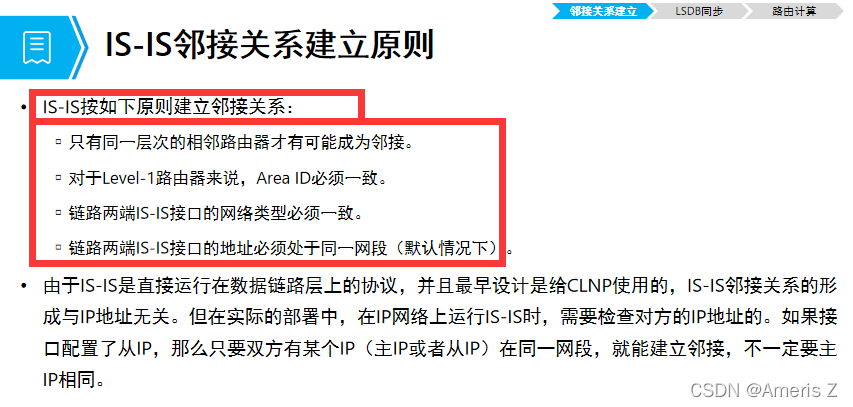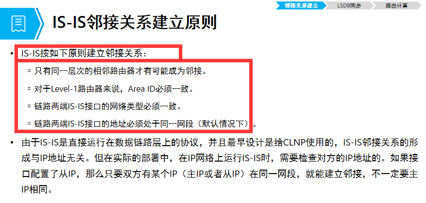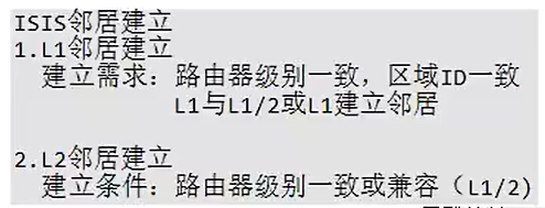 L1邻居建立:路由器级别一致,区域id一致(L1 与L1或 L1/2);L2邻居建立:级别一致或兼容