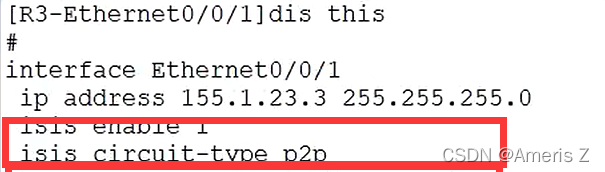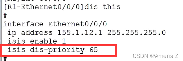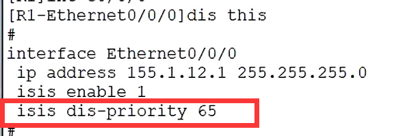 - isis默认优先级为64,修改优先级(改大为65)来将R1的接口修改伪节点