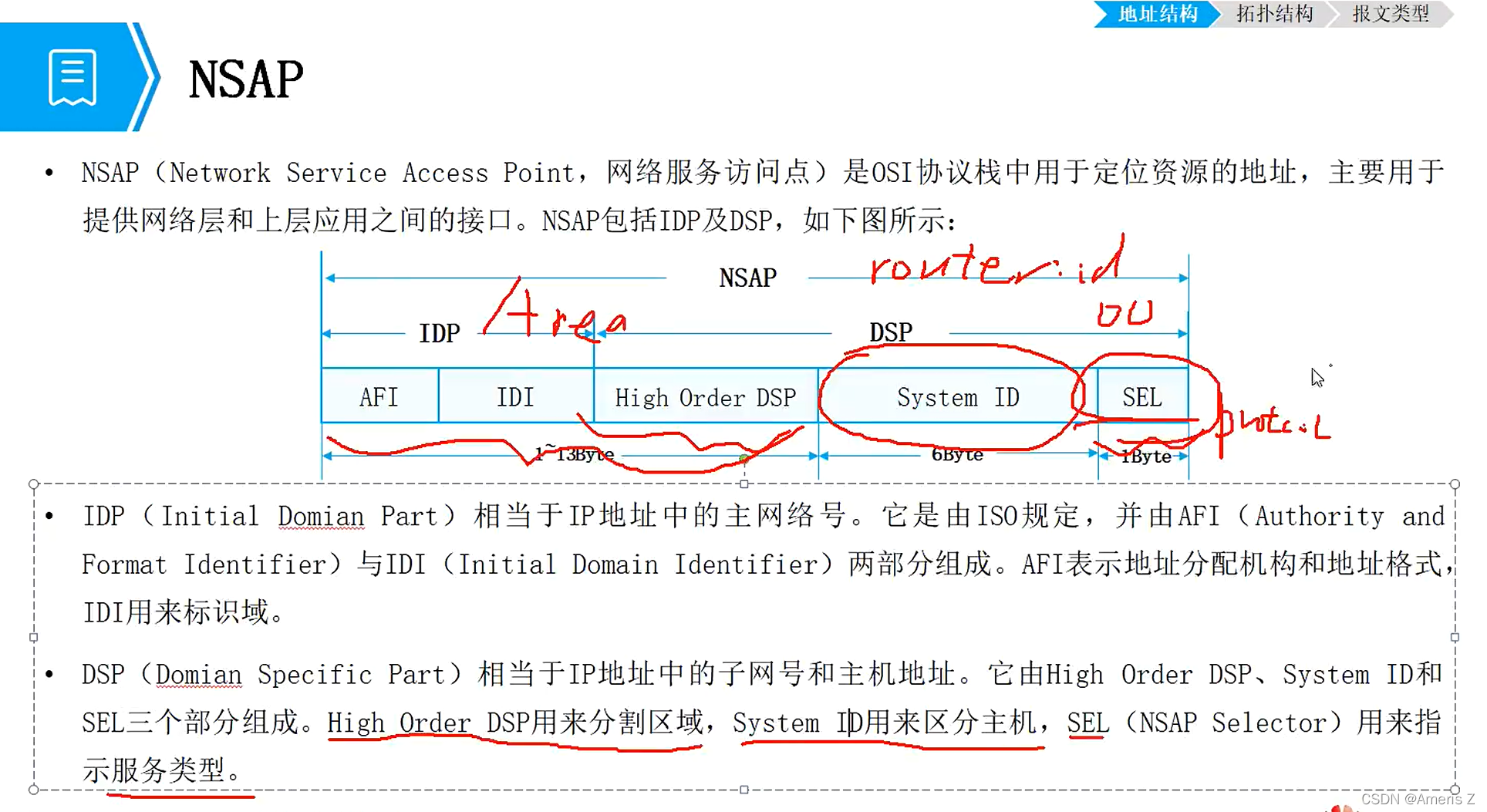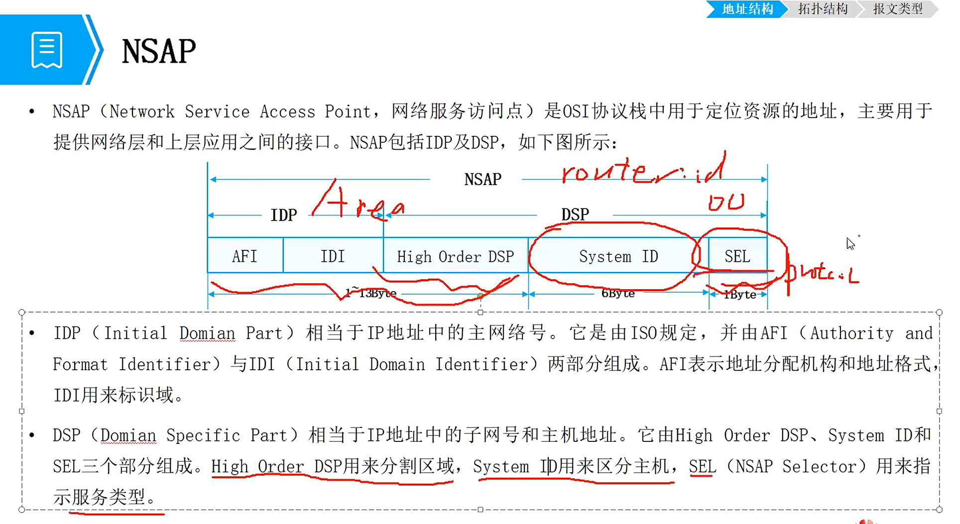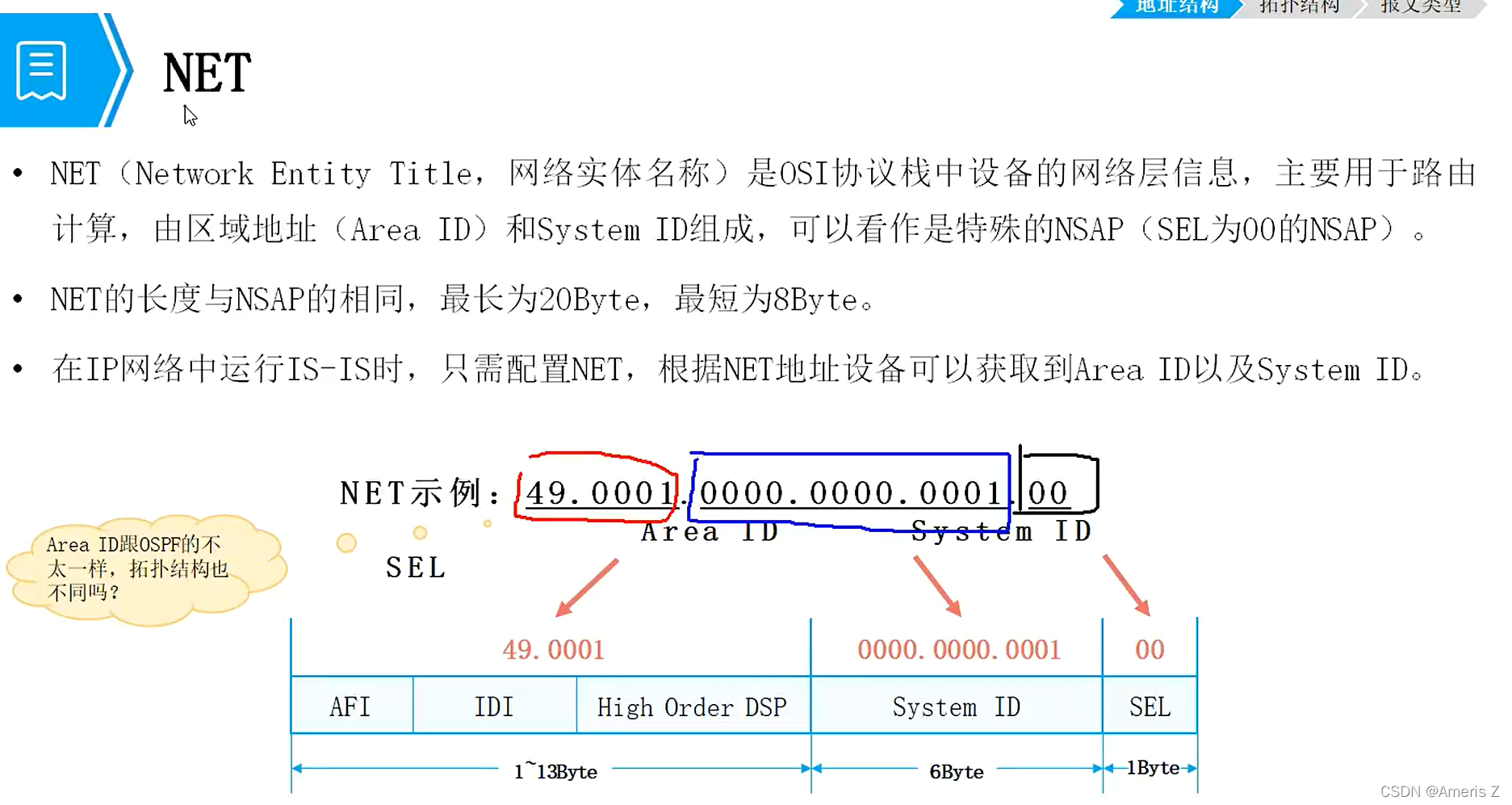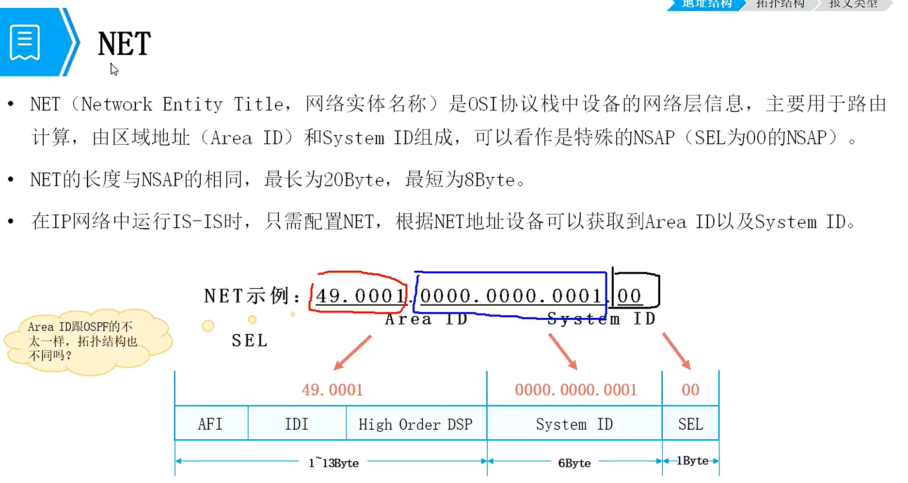 网络实体标志网络层的信息:area ID、system ID、SEL(类似于协议号,默认为00)