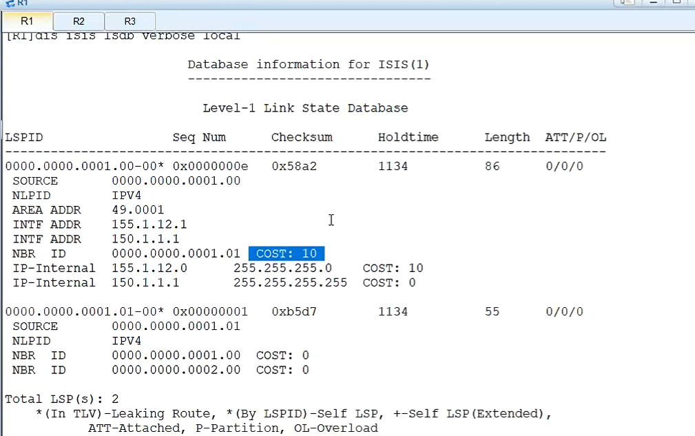ATT/P/OL,其中P为虚链路,但是由于厂商到目前为止都没开发出来,所以被认为isis没有虚链路,这里一直都为0