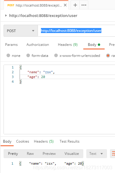 2020-08-22 15:22:52.032 INFO 17512 --- [nio-8088-exec-1] c.zsx.exception.GlobalExceptionHandler1 : RequestBody Parameters : { "name": "zsx", "age": 20}