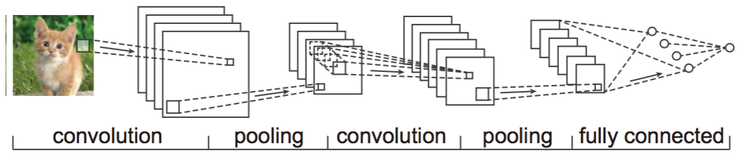 如图所示,卷积神经网络先由若干个卷积和池化层进行局部特征识别和降维,之后再用若干全连接层去分类。