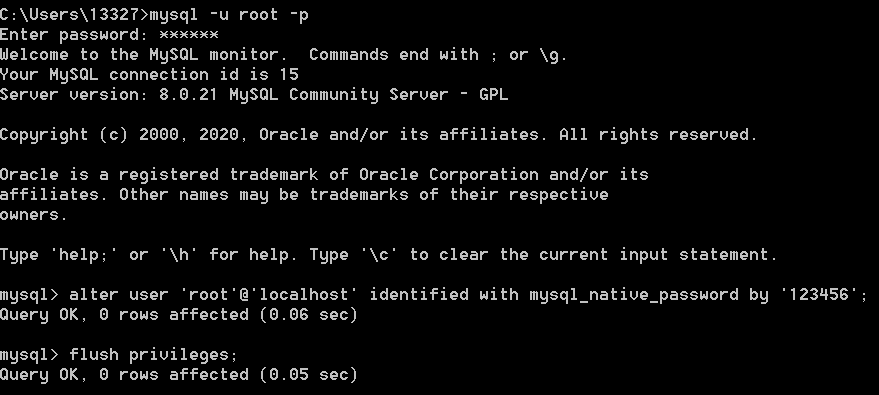 alter user 'root'@'localhost' identified with mysql_native_password by '123456';
