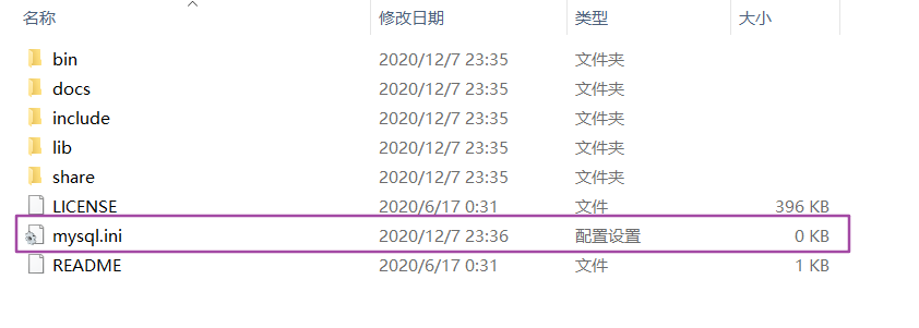 在E:\devSofts\mysql-8.0.21-winx64\mysql-8.0.21-winx64目录下新建mysql.ini作为配置文件。