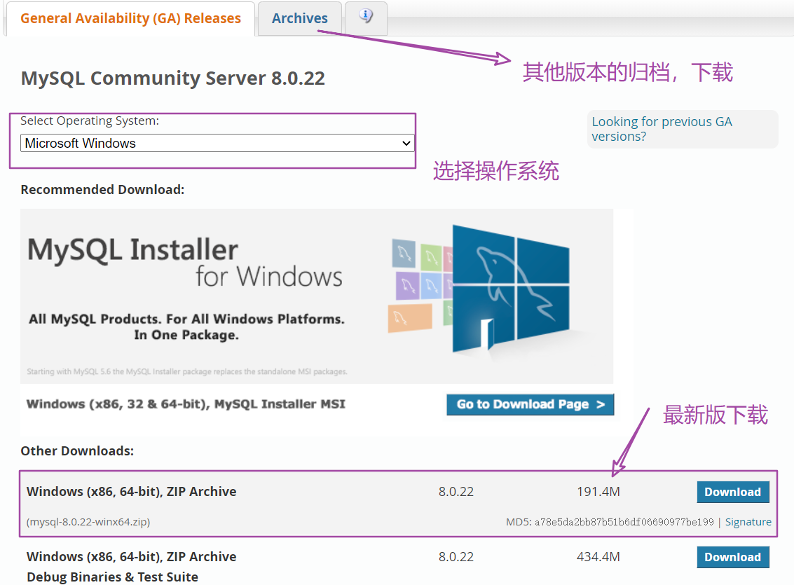下载地址:https://dev.mysql.com/downloads/mysql/