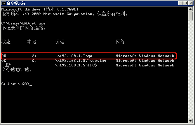 输入net use,状态为ok,表示已完成映射共享(即\\192.168.1.7\qa成功映射为本机的Y盘)